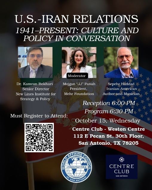 - SPECIAL EVENT PACKAGE: As a special offer to Harvard Club of San Antonio members and HBS Club of San Antonio members, once you join the World Affairs Council of San Antonio for $35.00 you can go to the World Affairs Council of San Antonio special event, US-Iran Relations, Iran history 1941-2025 this Wednesday October 15th 6:00pm-8:00pm at the Weston Centre 30th for the reduced rate of $15.00.