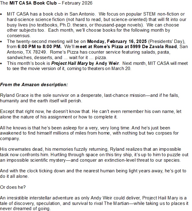 Our friends from MIT CASA have invited us to join them at their next MIT CASA book club. The book selection for February is Project Hail Mary by Andy Weir. And, next month, MIT CASA will meet to see the movie version of the book, coming to theaters on March 20th!